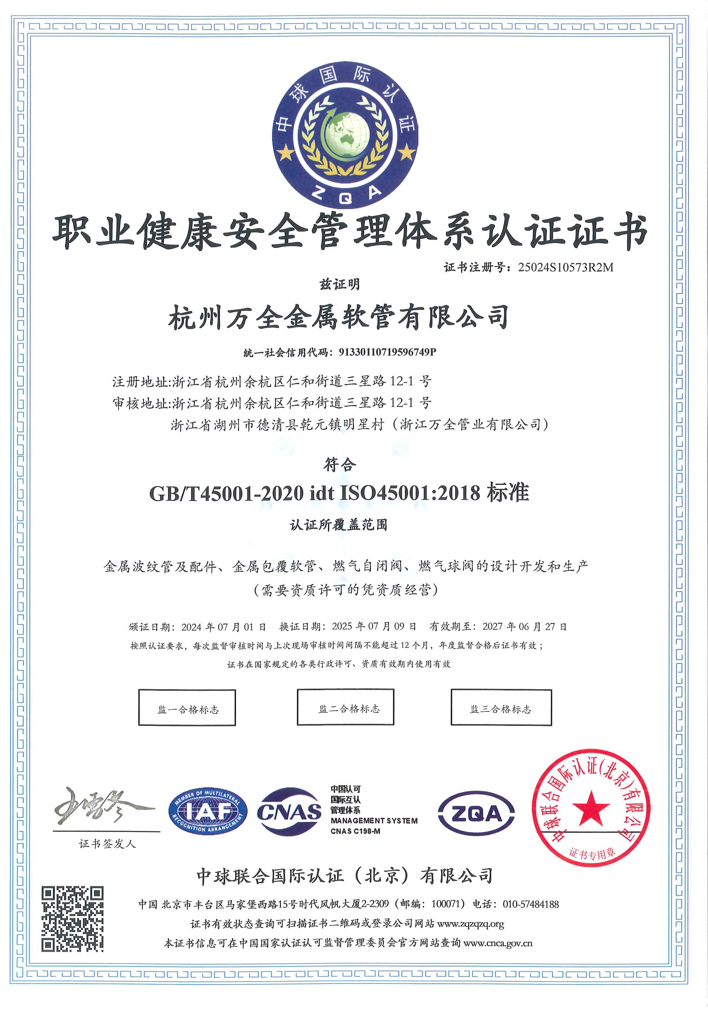 ISO45001职业健康安全管理体系认证证书