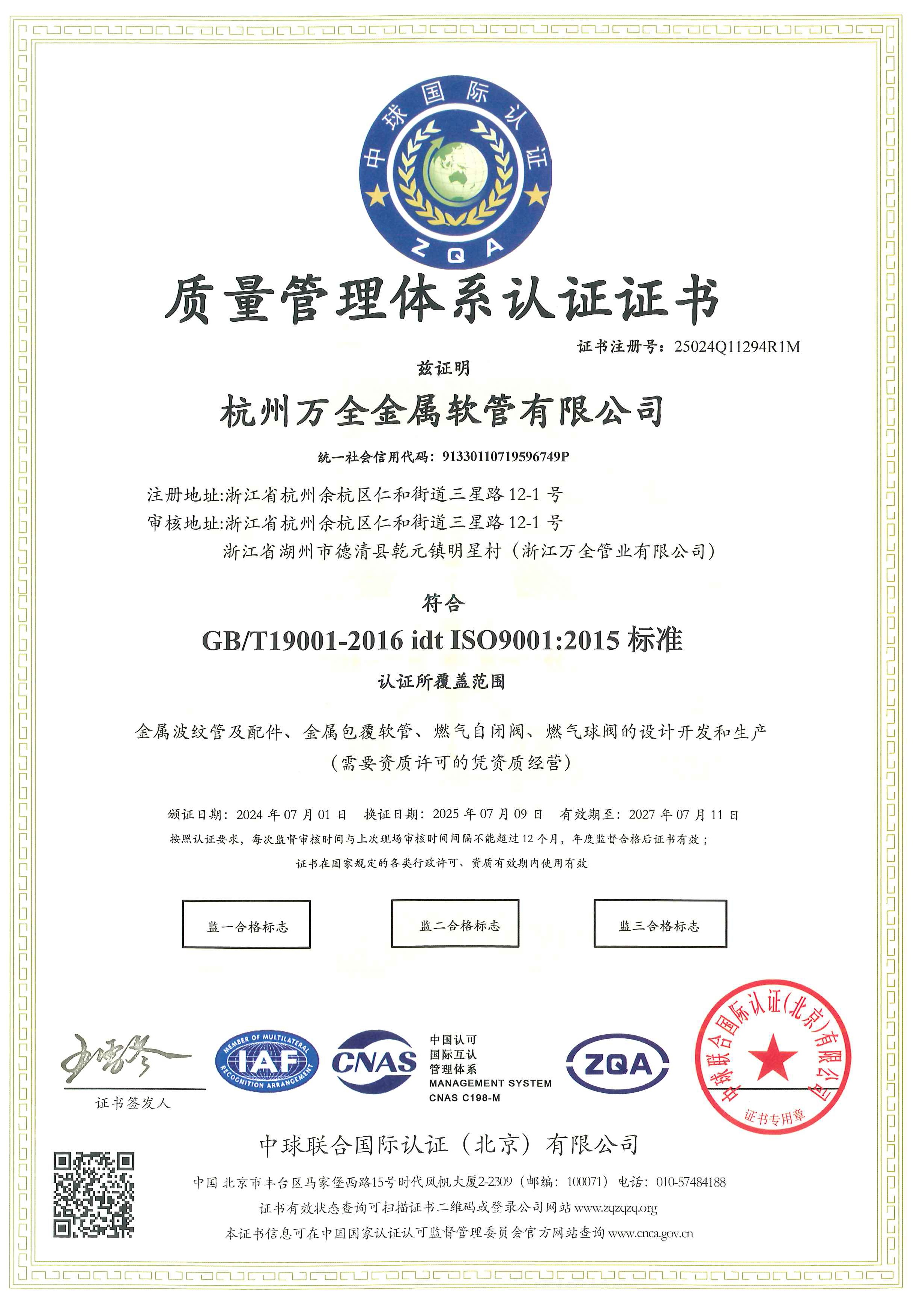 ISO9001质量管理体系认证证书