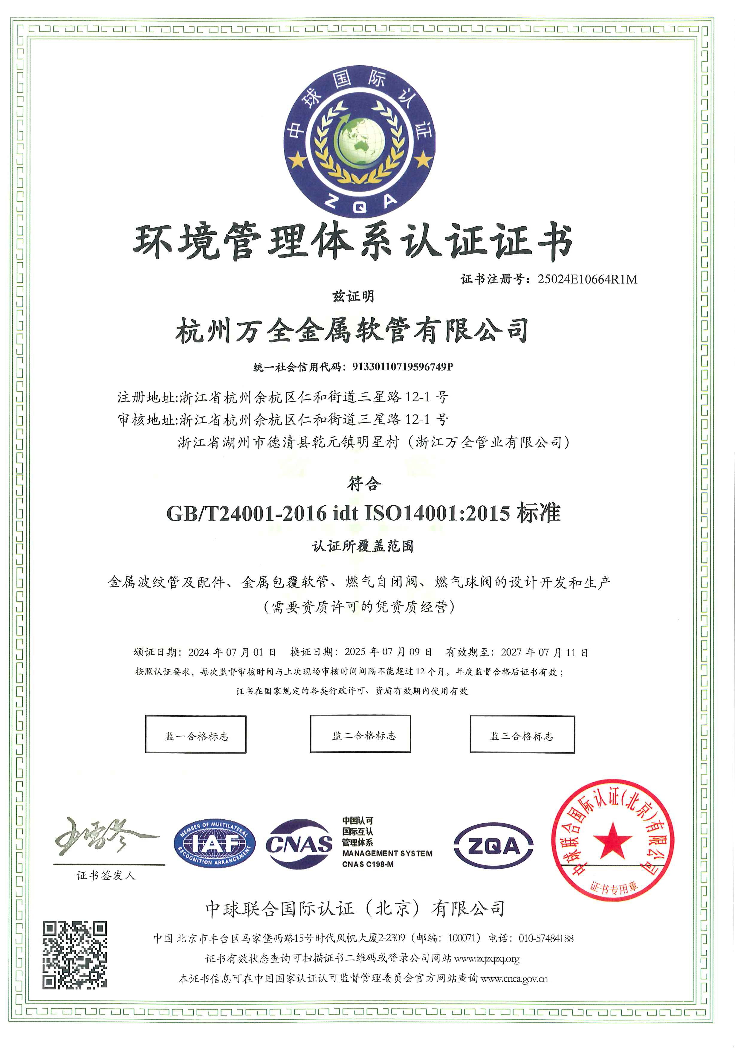 ISO14001环境管理体系认证证书