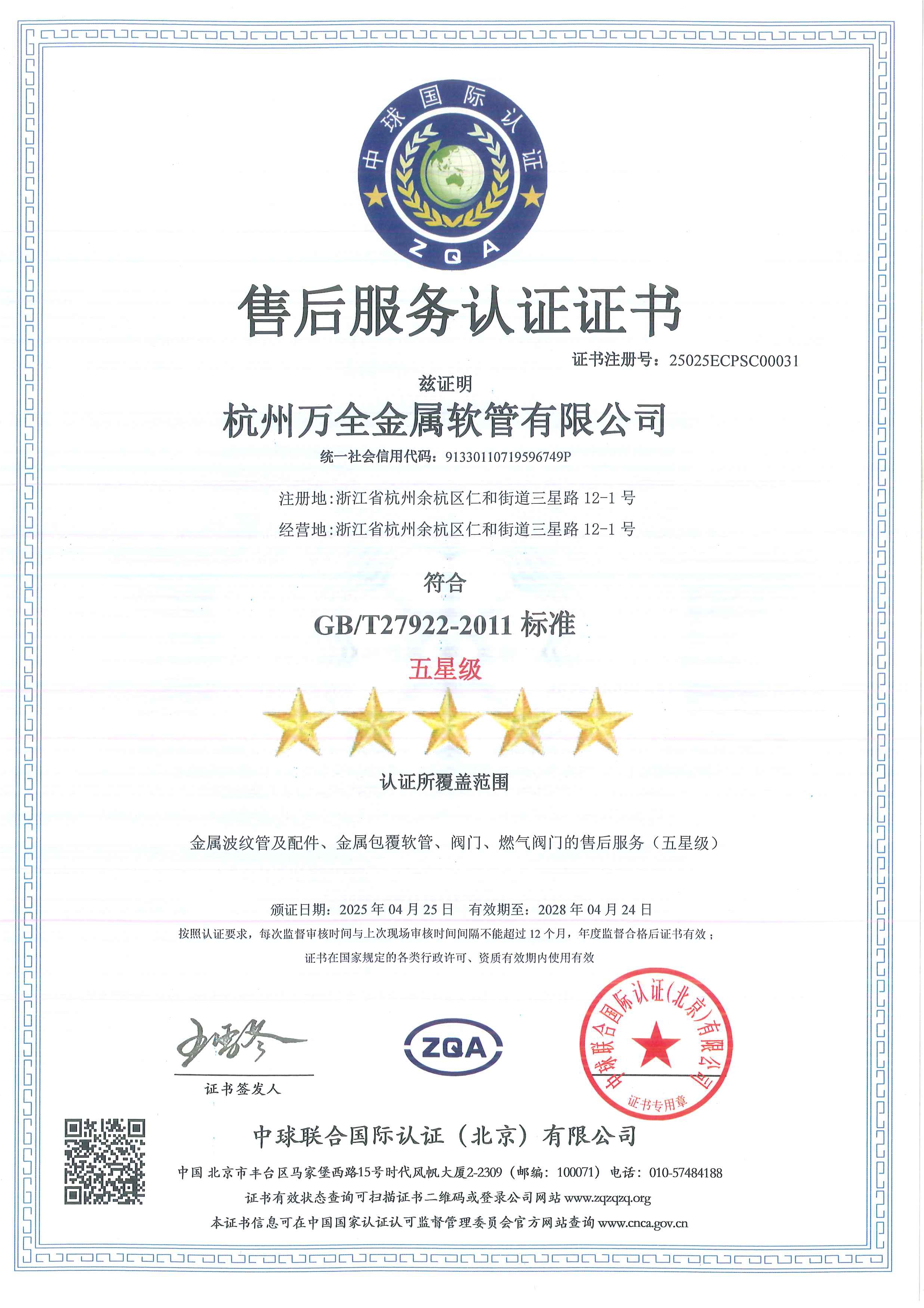 售后服务认证证书