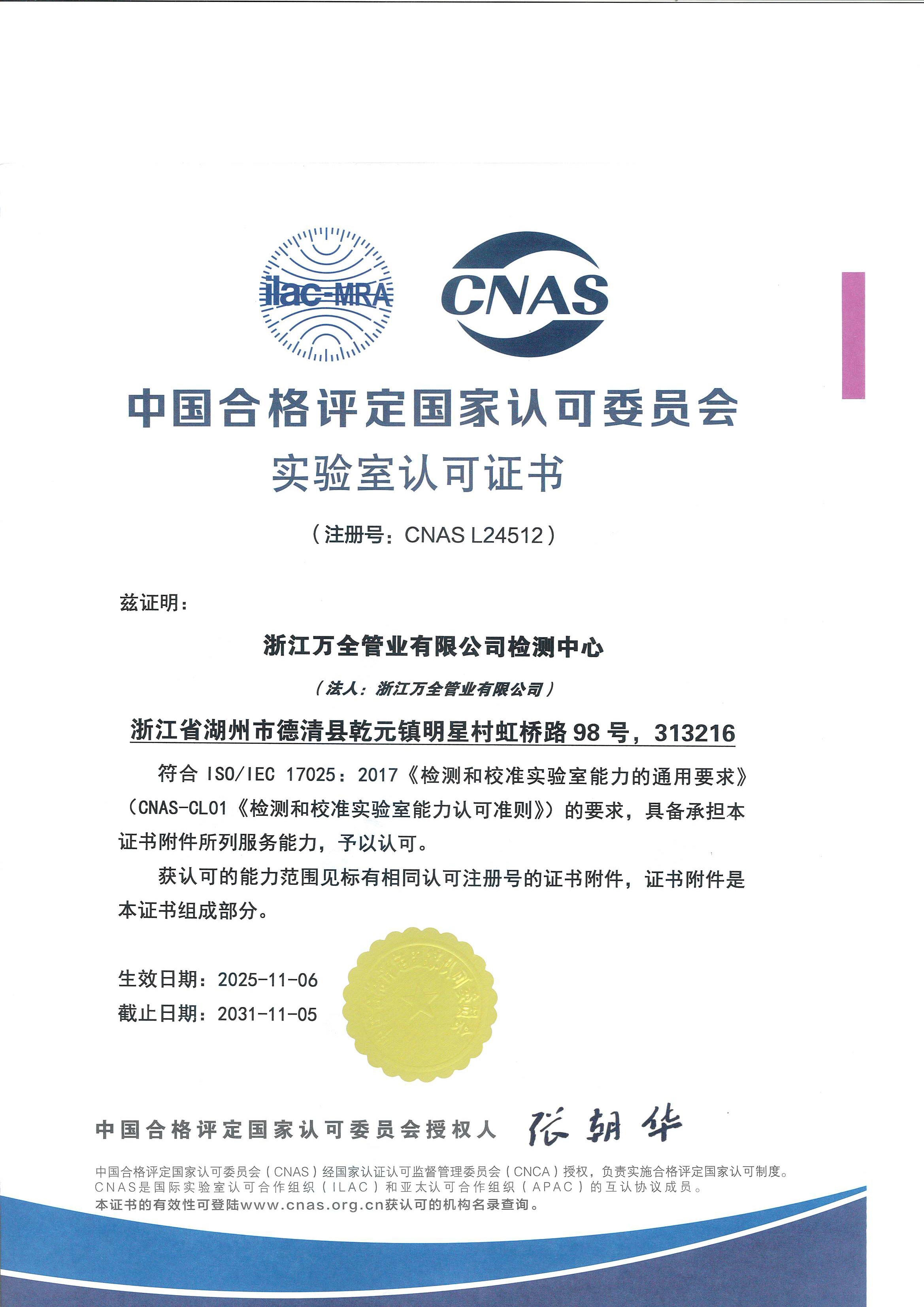 CNAS实验室认可证书
